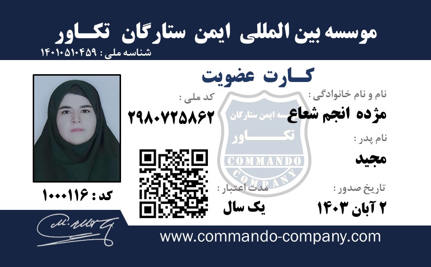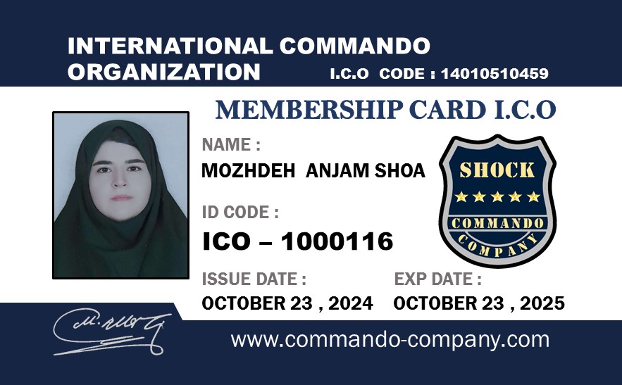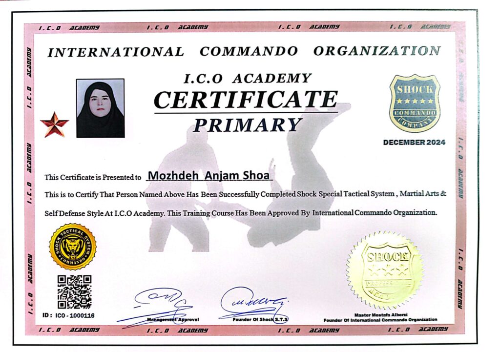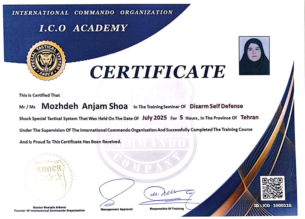خانم مژده انجم شعاع Ms. Mozhdeh Anjam Shoa کارت عضویت Membership Card گواهینامه مقدماتی هنرهای رزمی و دفاع شخصی Certificate of Primary Martial Arts & Self Defense گواهینامه سمینار دفاع شخصی خلع سلاح مقدماتی Certificate of Primary Disarm Self Defense Seminar