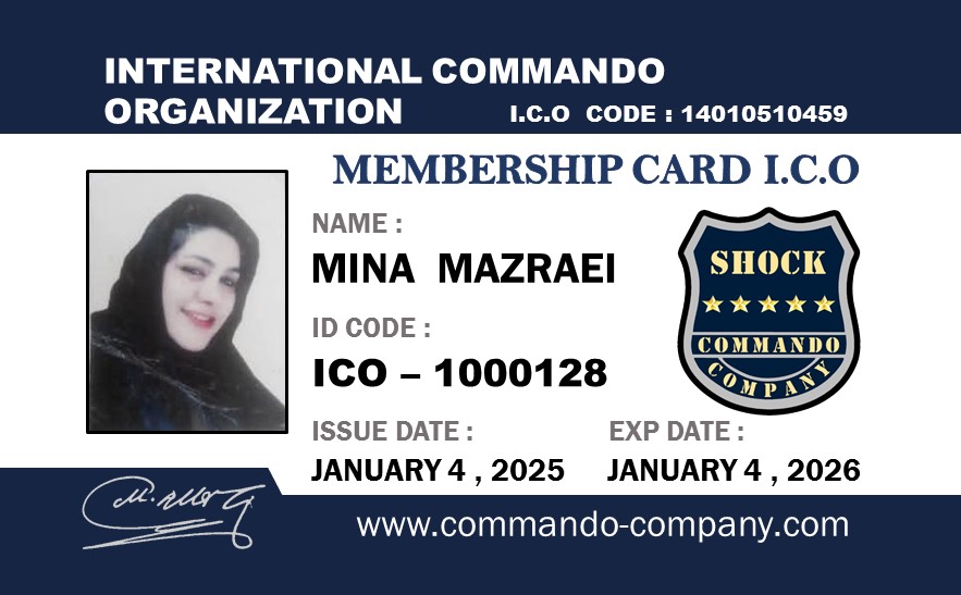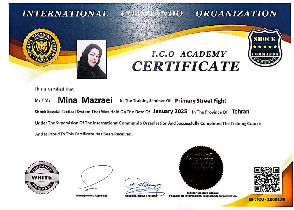 خانم مینا مزرئی Ms. Mina Mazraei کارت عضویت Membership Card گواهینامه سمینار استریت فایت مقدماتی Certificate of Primary Street Fight Seminar