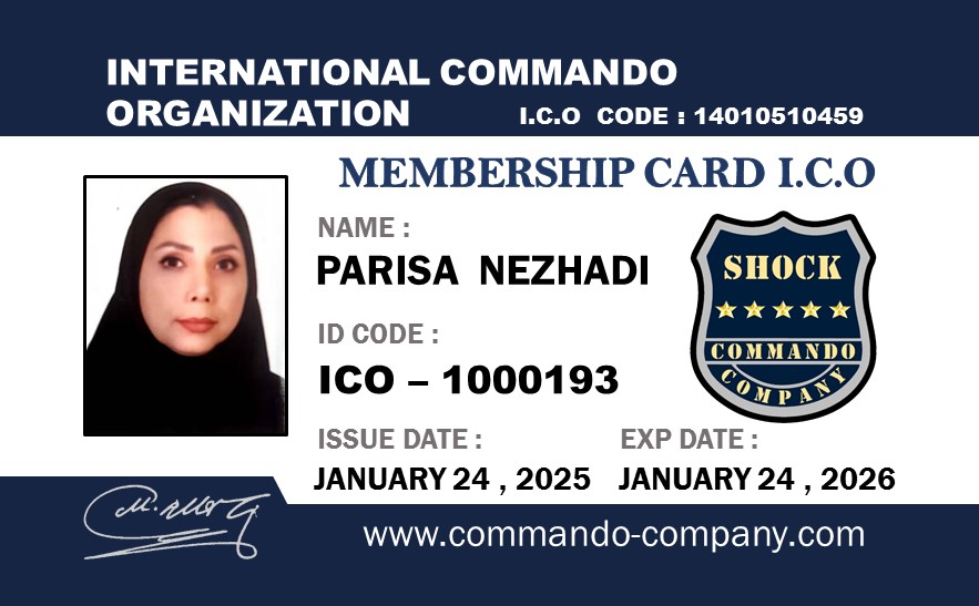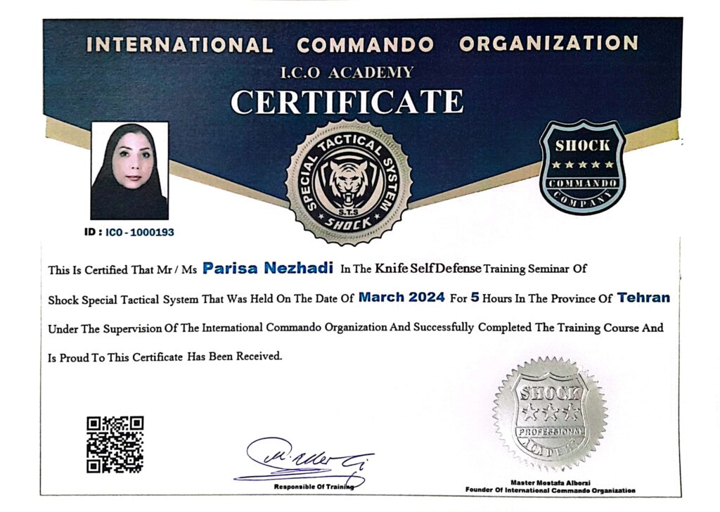 خانم پریسا نژادی Ms. Parisa Nezhadi کارت عضویت Membership Card گواهینامه سمینار دفاع شخصی Certificate of Knife Self Defense Seminar