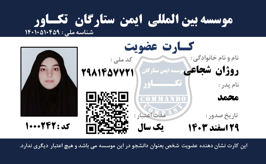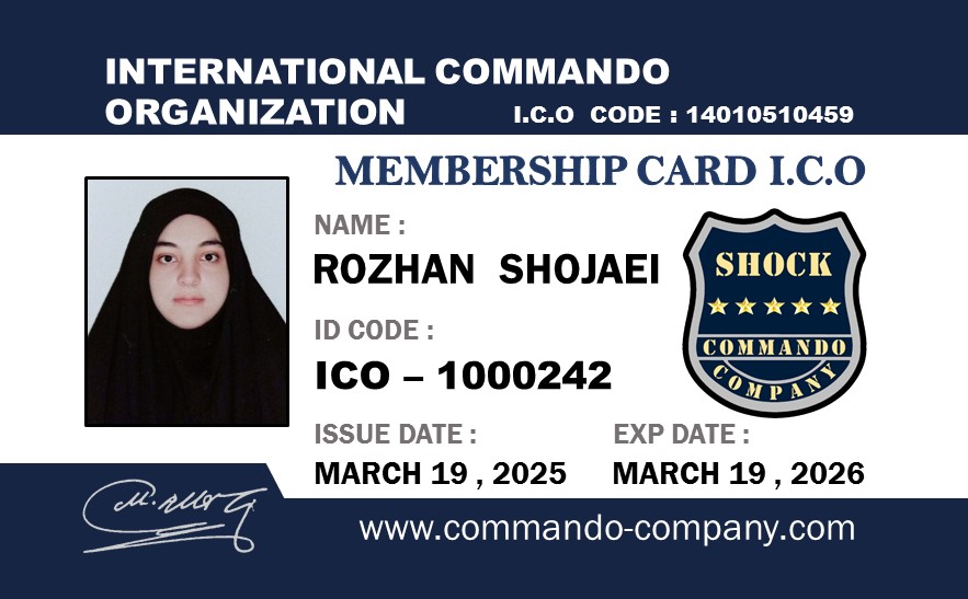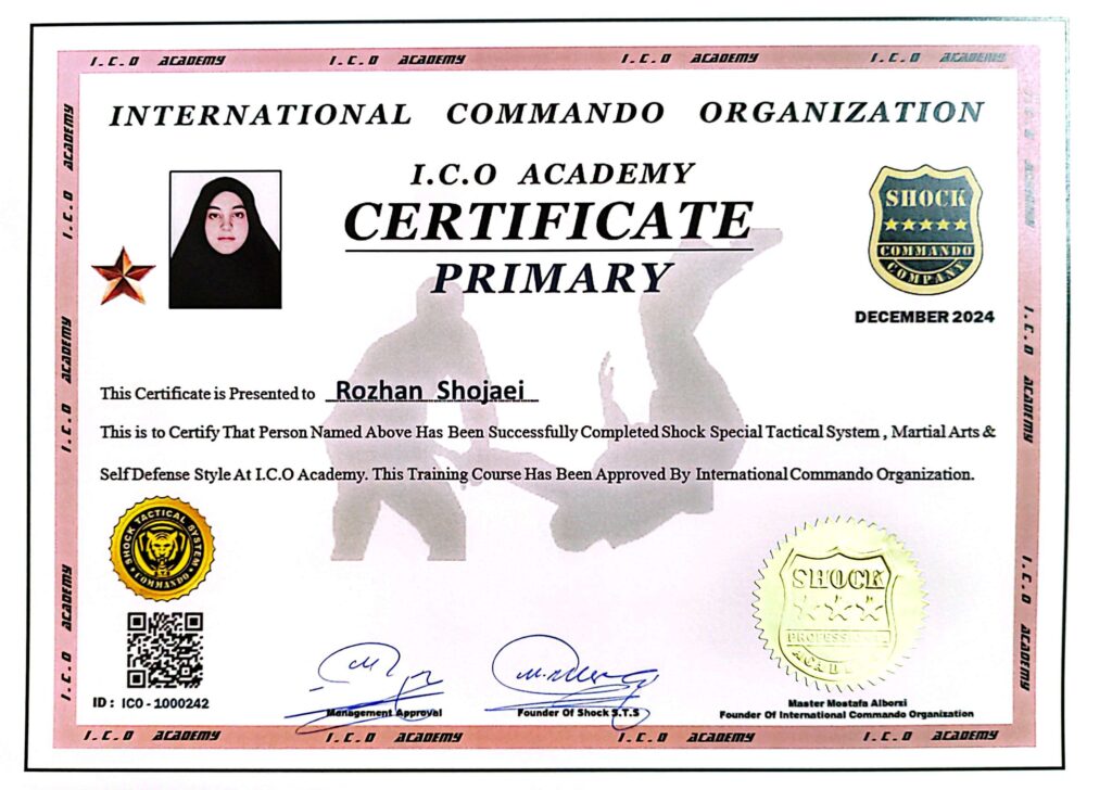خانم روژان شجاعی Ms. Rozhan Shojaei کارت عضویت Membership Card گواهینامه مقدماتی هنرهای رزمی و دفاع شخصی Certificate of Primary Martial Arts & Self Defense
